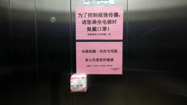 (电梯间配备纸巾防止病毒传播)